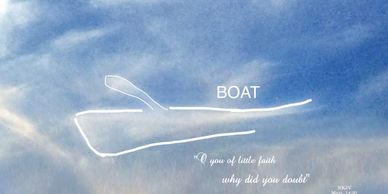 An image of a boat in the wind refers to Matthew 14:25-32. When Peter stepped out of the